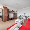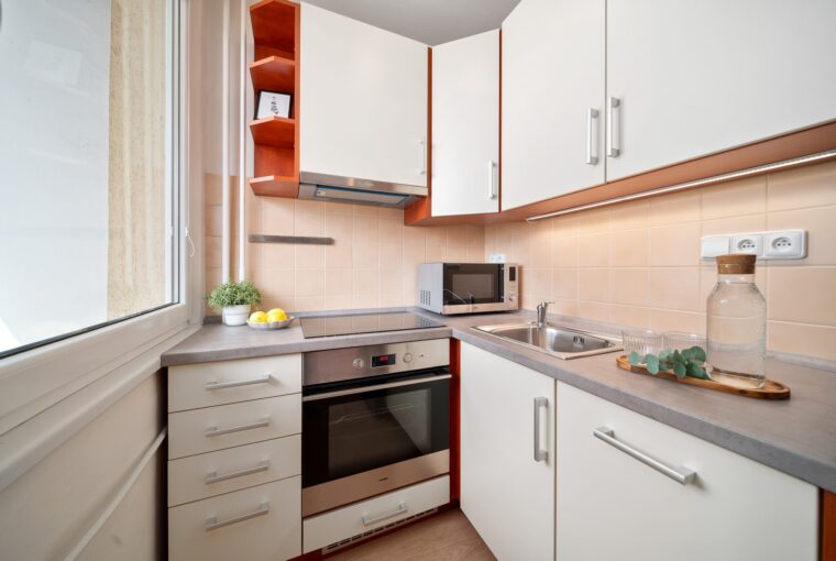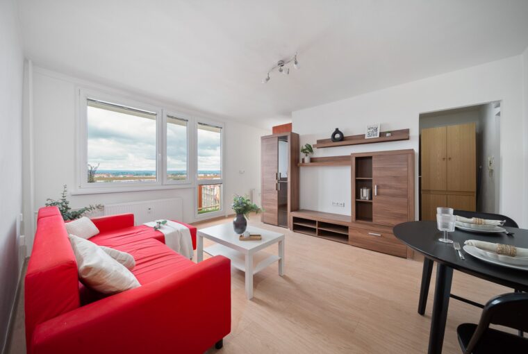 • obývací pokoj s kuchyňským koutem, vybaveným indukční varnou deskou, elektrickou troubou, digestoří, lednicí s mrazákem, myčkou a mikrovlnnou troubou; z obývacího pokoje je přímý vstup na prostornou lodžii s výhledem na Železné hory – ideální místo pro odpočinek