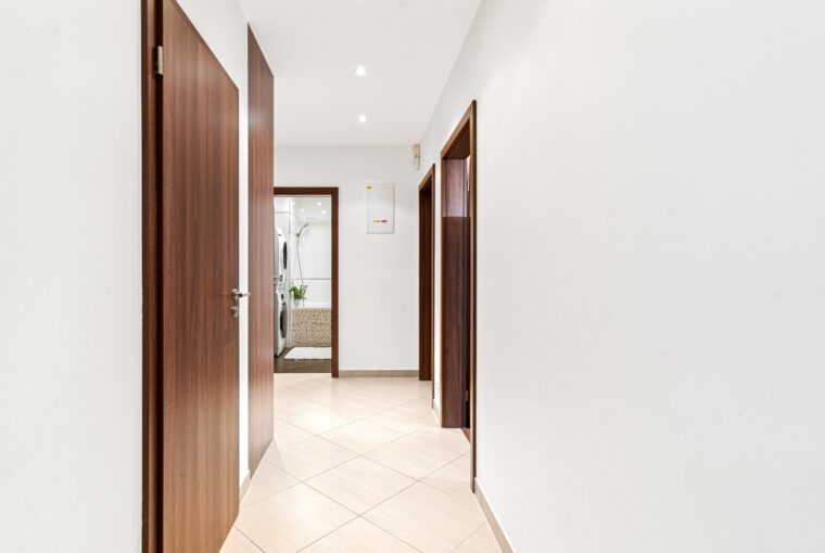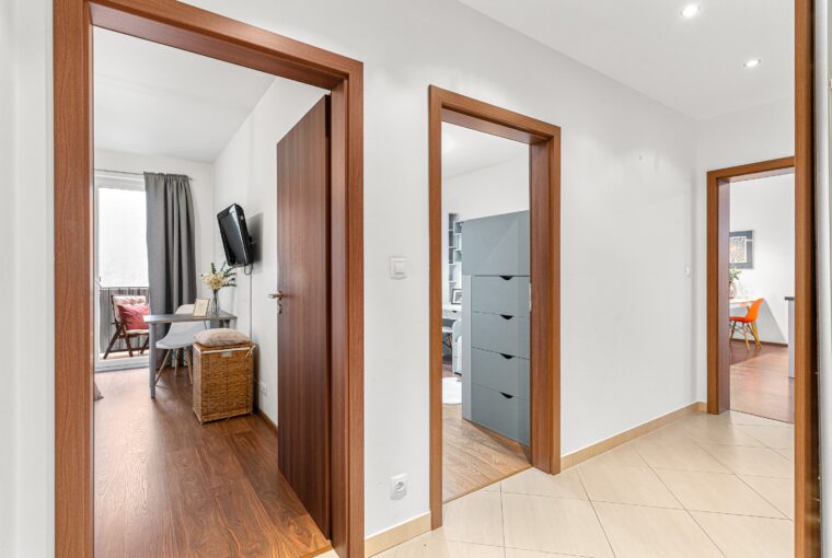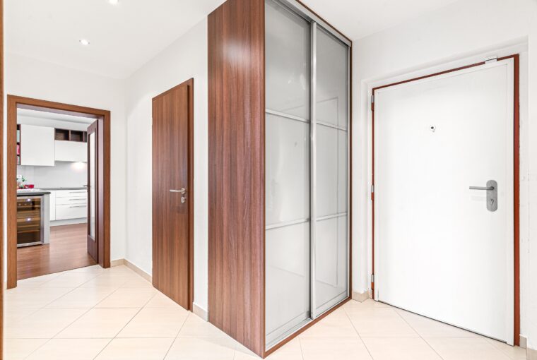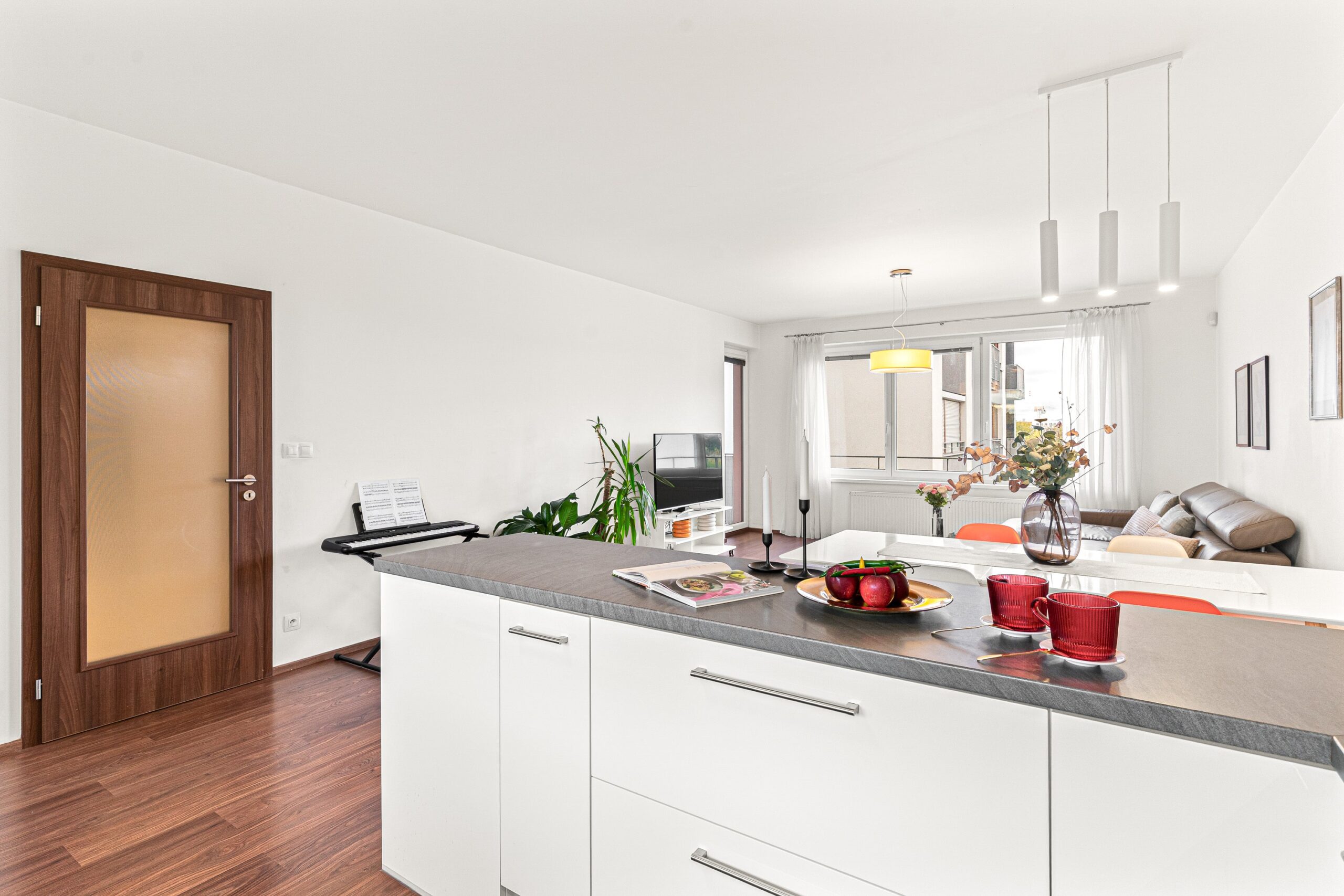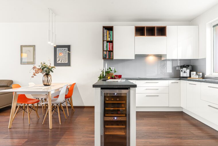 Dispozice bytu nabízí velmi příjemné a funkční rozložení: vstupní chodba, prostorný obývací pokoj s kuchyní o velikosti téměř 40 m², ložnice, dětský pokoj, koupelna a samostatná toaleta. Všechny pokoje jsou neprůchozí. Byt působí světlým, moderním a útulným dojmem. Součástí vybavení je kuchyně na míru a vestavěný nábytek, který může zůstat součástí ceny bytu (kromě dětského pokoje a několika drobností – upřesníme s konkrétním zájemcem). Byt disponuje zabezpečovacím systémem Jablotron s pohybovými čidly.