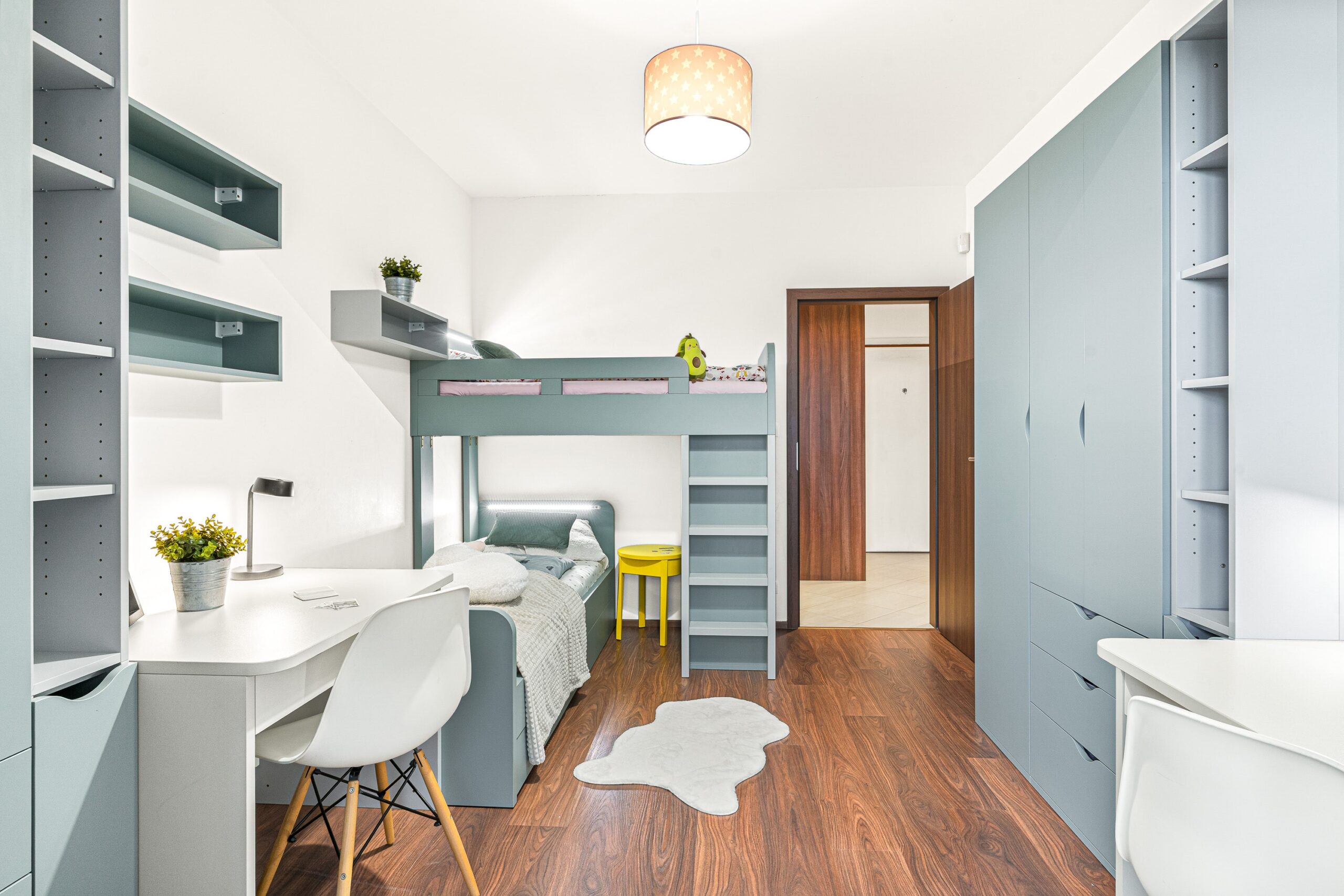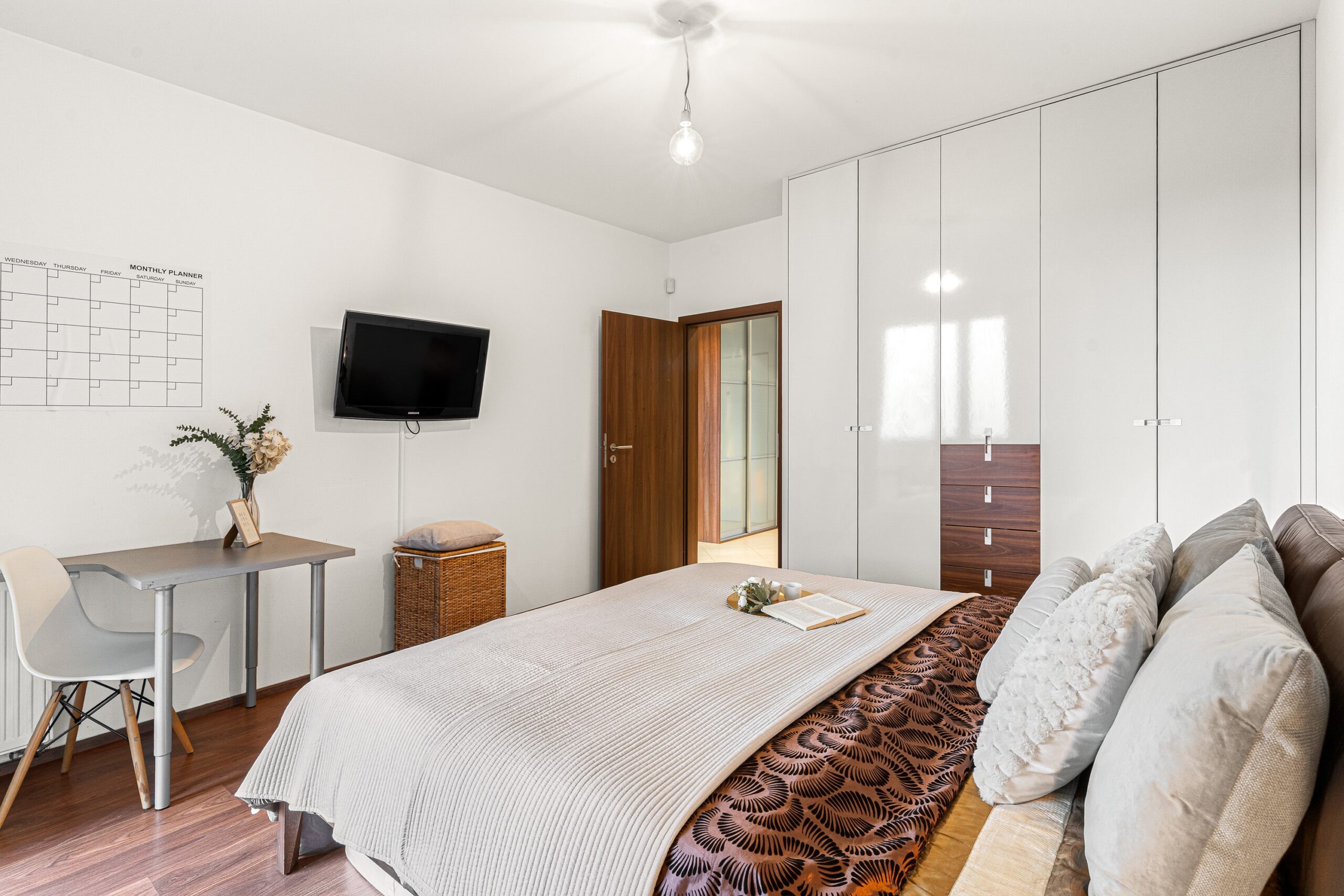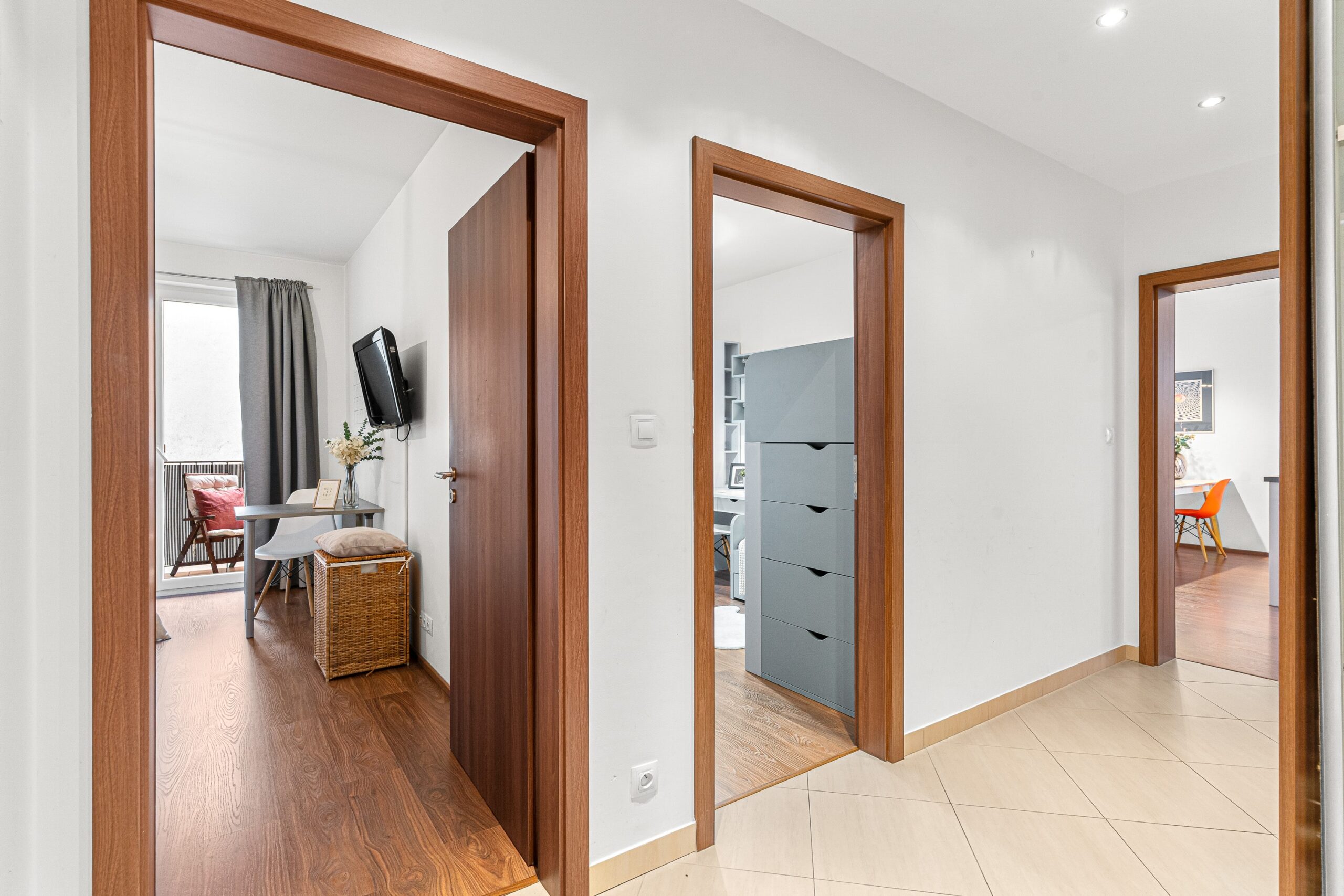 Dispozice bytu nabízí velmi příjemné a funkční rozložení: vstupní chodba, prostorný obývací pokoj s kuchyní o velikosti téměř 40 m², ložnice, dětský pokoj, koupelna a samostatná toaleta. Všechny pokoje jsou neprůchozí. Byt působí světlým, moderním a útulným dojmem. Součástí vybavení je kuchyně na míru a vestavěný nábytek, který může zůstat součástí ceny bytu (kromě dětského pokoje a několika drobností – upřesníme s konkrétním zájemcem). Byt disponuje zabezpečovacím systémem Jablotron s pohybovými čidly.