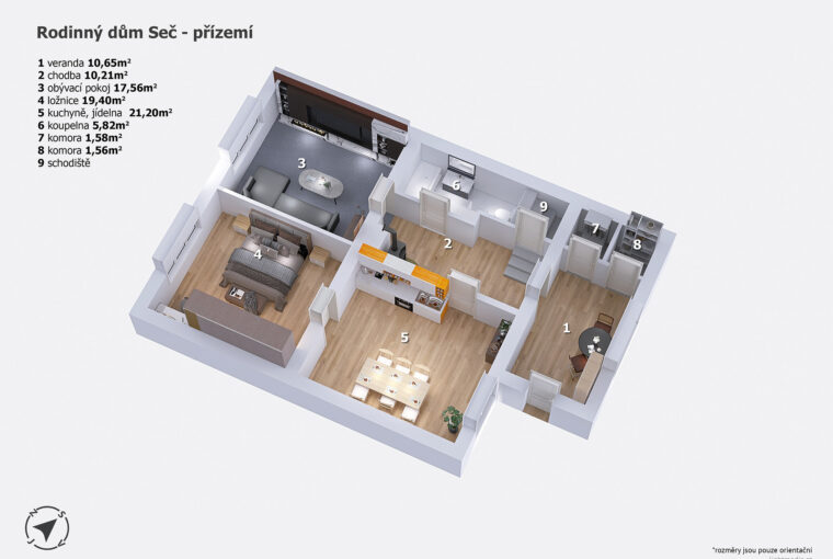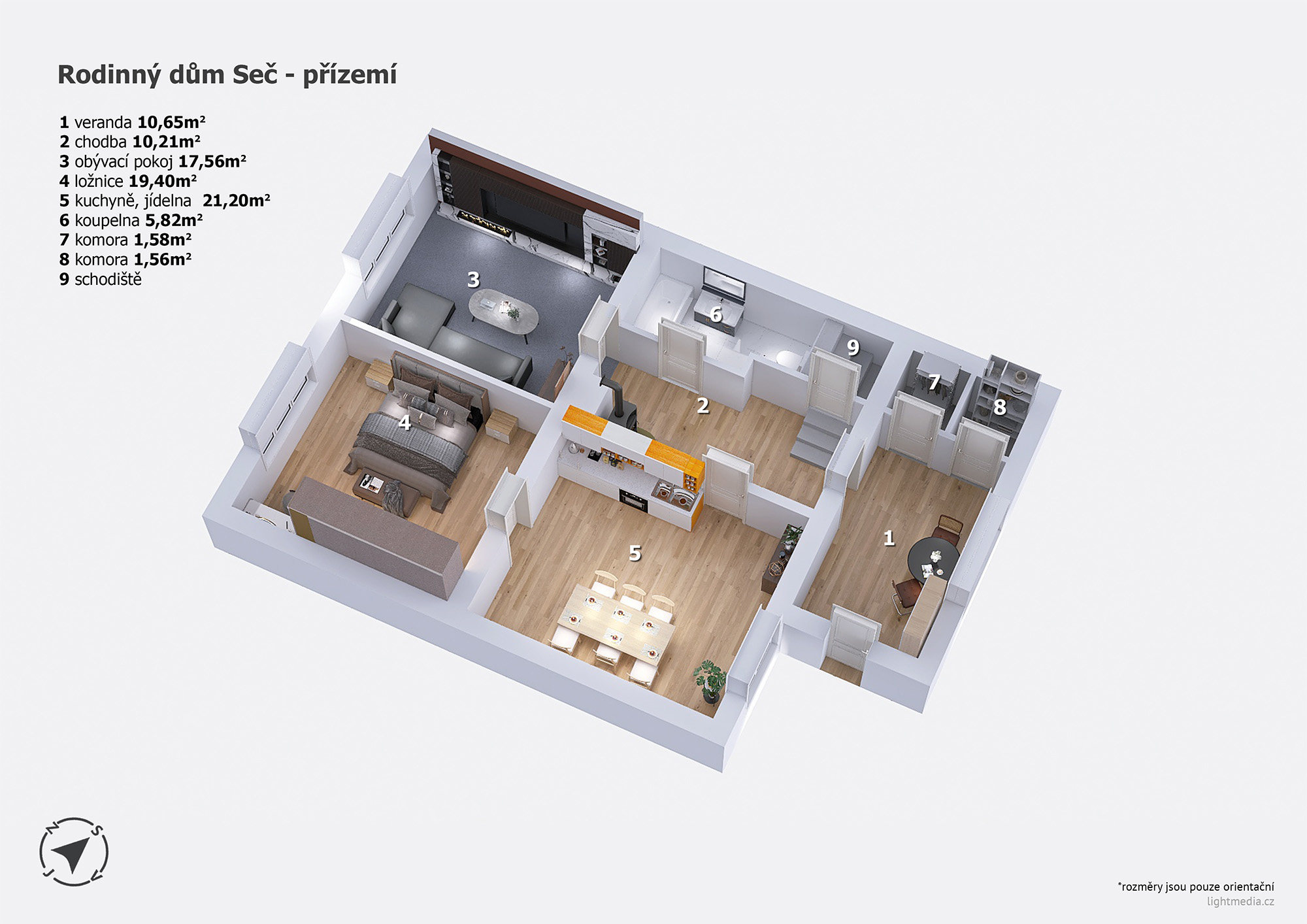 V přízemí (1. NP) se nachází veranda, vstupní chodba, kuchyň, obývací pokoj, ložnice, koupelna s toaletou, spíž a šatna.